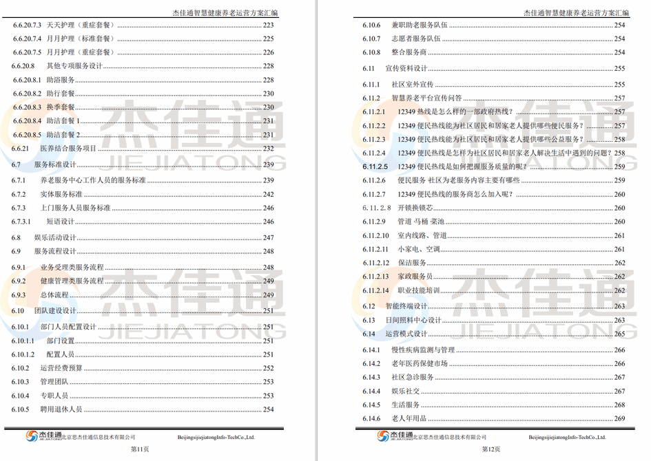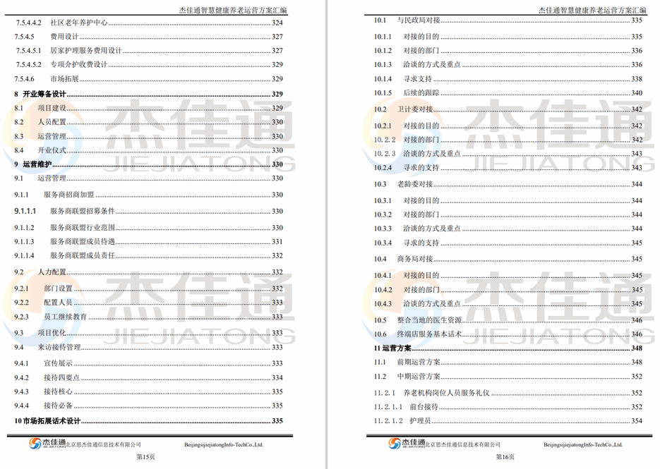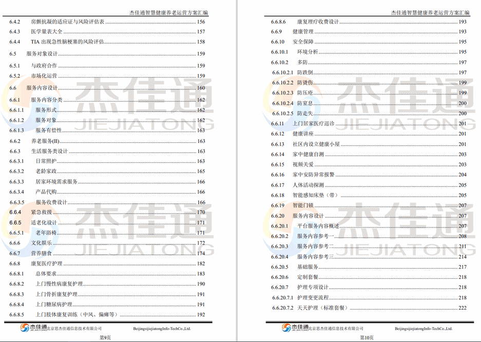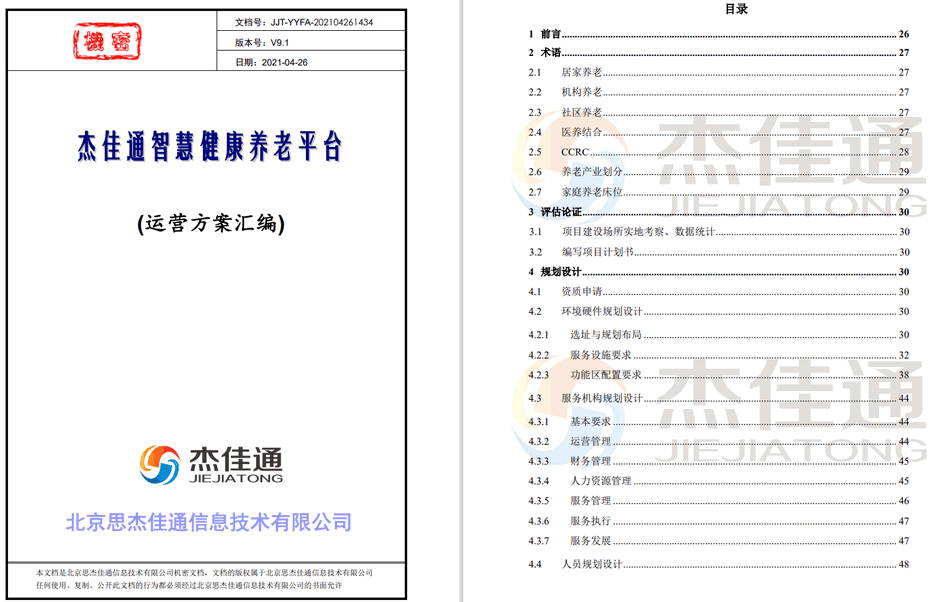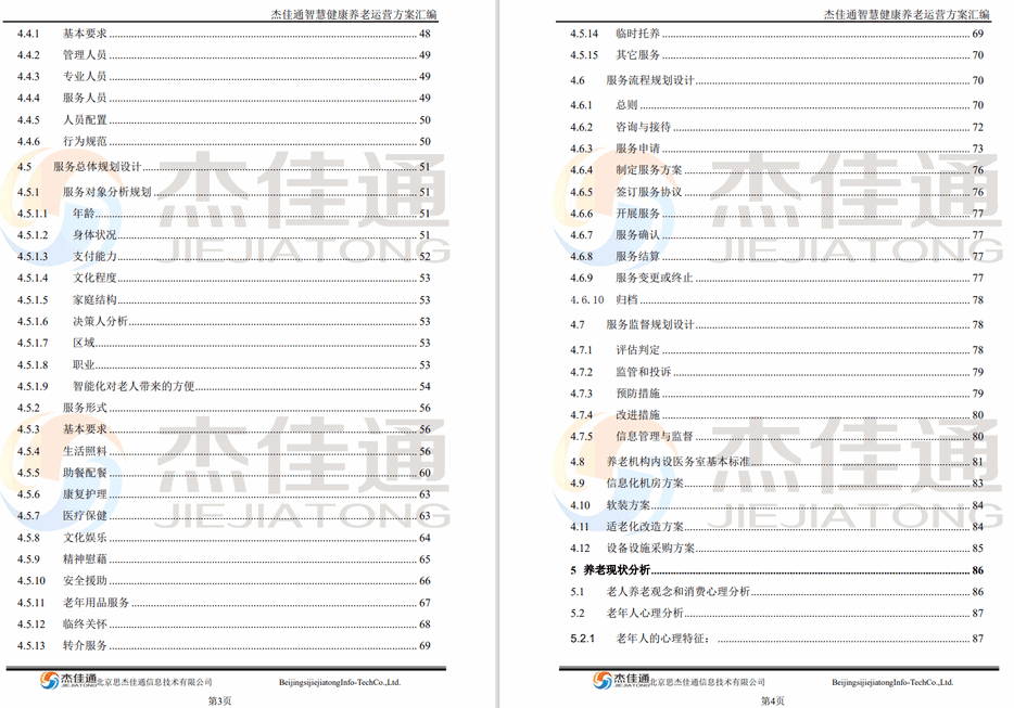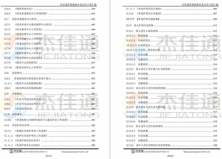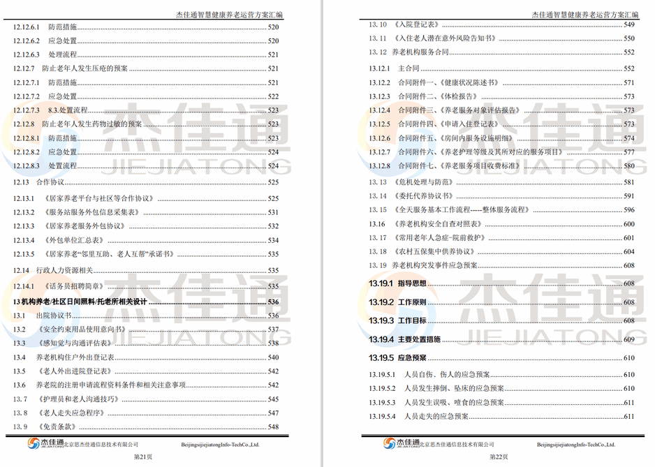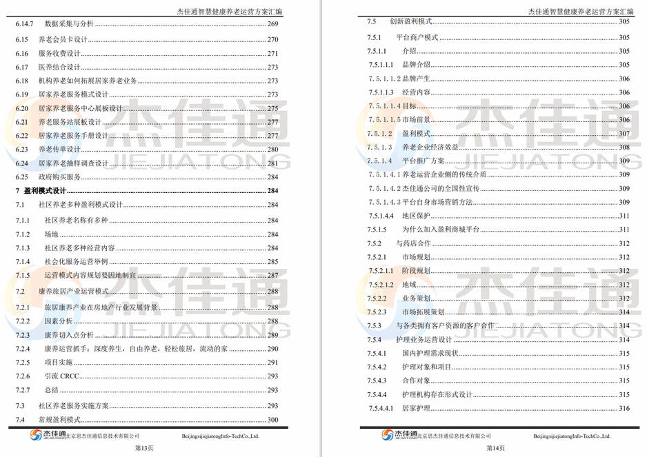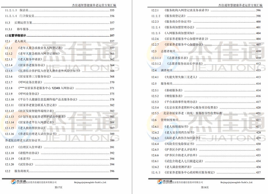 本养老运营方案凝聚了杰佳通工程师们16年的心血,总结出了居家养老、机构养老、社区养老运营过程中团队组建、运营设计、方案设计、活动设计、老人心里分析、各种环境下的养老运营盈利模式等等,方案每月都在更新,目前已经更新到近千页,方案精细,细致到在社区如何组织老人活动,如何书写宣传语,如何和老人签订协议,即使你是“0”基础入门养老,也可以让您快速上手,快速盈利;既避免了您少走弯路,又避免了在简单事情上浪费时间,充分把杰佳通智慧养老平台的精髓融入到养老运营中。